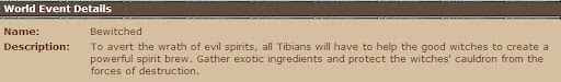 A quantidade de itens varia de fase pra fase, o item necessário naquele momento estará à vista em altares ao lado do caldeirão. Serão itens aleatórios em diversas quantidades, é possivel que o mesmo ingrediente seja necessário várias vezes, em sequência. Ao ínicio de cada fase, e cada vez que um item for usado no caldeirão, diversas criaturas das trevas atacarão numa área de combate, abaixo ao caldeirão. Essas criaturas terão como loot o "Dry Piece of Wood" ![]() ![]() Cada vez que um item é necessário, ele aparece em altares ao lado do caldeirão. Os jogadores que usarem pelo menos 1 item no caldeirão, receberão o achievement "Witches Lil' Helper". Aqueles que utilizarem 50 itens, ou mais, serão nomeados com o achievement "Banebringers' Bane". Se o servidor conseguir manter o caldeirão aceso e trazer todos os ingredientes da receita no tempo certo, ao final do evento, ele será vencedor. Todos os participantes serão contemplados com um prêmio. A Bewitched Global Quest, foi implantada em dezembro de 2010, mas essa é a primeira vez que o evento acontece. Por conta disso, informações como tempo de duração e premiações globais ainda são muito escassas. Vale a pena organizar o seu servidor, seja qual for seu level ou vocação, e ajudar as bruxas com o preparo da poção. Muitos servidores já criaram listas de ingredientes nos fóruns e estão juntando todos as doações de itens, preparando-se préviamente para o evento. Acompanhe o andamento dos servidores na quest global, clicando aqui. É hora de tirar as sobras daquela sua hunt de minotaurs da backpack, doar aqueles tarantula eggs esquecidos no depot, para ajudar na criação da poção que salvará o continente tibiano das forças das trevas. ![]() |